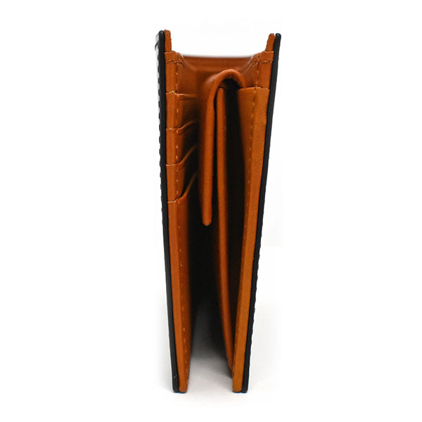 一般的なコードバンの財布は切り目仕上げによる縫製を行っているのがほとんど。この財布はコードバンは切り目にし、内作りの牛革はヘリ返しの技法で縫い合わせています。側面から見るとコードバンと牛革の色のコントラストがとても綺麗に見えます。製品としての美しさも追及した新しいデザインです。