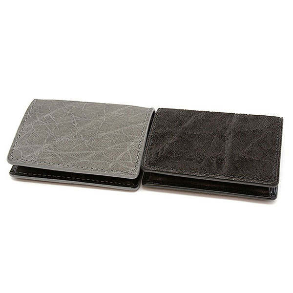 雄大な大地が育んだエレファントで違いをもたらす。他とは違う商品を持ちたい人におすすめの財布です。ワシントン条約により流通量に制限のあるエレファントレザーはそのルックスと存在感は圧巻。型押しでは表現できない独特な表情が最大の魅力で、その表情とは対照的に誰もが驚くしっとりとしたタッチ感が特徴です。革が非常に大きい為、商品一つ一つ違う模様となり、唯一無二の存在となります。革好きのコアなユーザーにこそ、ぜひ使ってほしいアイテムです。 そんな迫力のあるエレファントレザーをモダンに仕上げたのがこのエレファントシリーズ。薄作りをコンセプトに革の厚みや縫製に至るまで職人のこだわりが込められています。またデザイン的にはモダンでシャープな表情に仕上げています。内作りにはクロのスムースレザーを用い、カード段のサイドを切り落としにするなど使い勝手とデザインとを融合させた作りが特徴です。