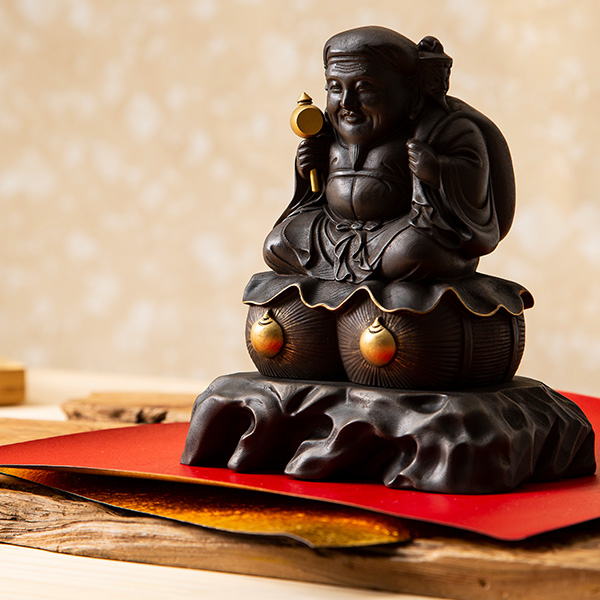 本品は稀有な存在の福の神を、ほぼ原寸大で再現したものです。手に乗るサイズで元は金箔で覆われていたが秀吉が常に触れて落ちたと言われるその味も忠実に再現しています。また、一体一体所蔵寺院の圓徳院にて開眼供養の御祈祷を施し、御精入れしたものとなります。御祈祷の証となる証明書と、ありがたい御札をお付けしてお届けさせていただきます。ぜひ、あなたも天下人の夢にあやかってください。