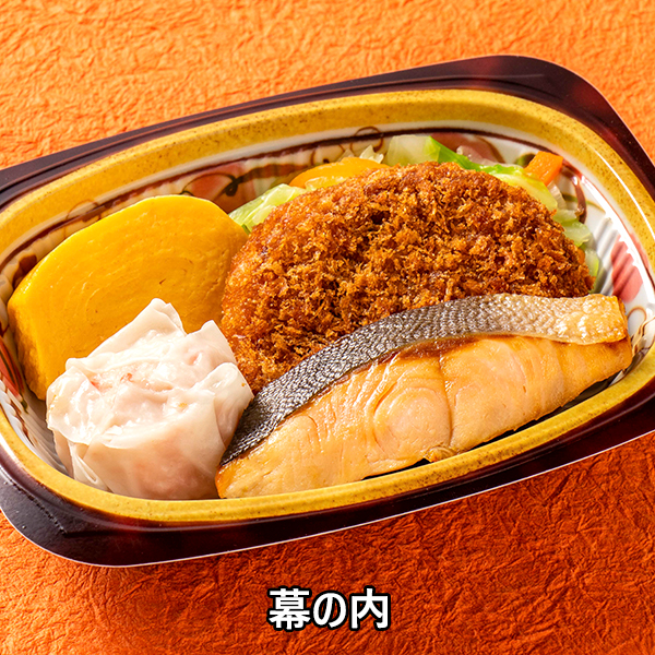 | 原材料:幕の内 | メンチカツ(国内製造)、カラフトマスの塩漬け(インドネシア製造)、キャベツ(国産)、かに風味しゅうまい、だし巻玉子、食用大豆油、人参、食塩/加工デンプン、グリシン、調味料(アミノ酸等)、pH調整剤、着色料(紅麹、カロチン、ラック、カラメル)、増粘多糖類、(一部に卵・小麦・かに・えび・さけ・大豆・鶏肉・豚肉を含む) |