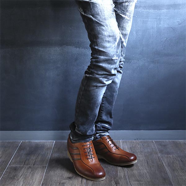 同社が作るヒールアップシューズは、女性のハイヒールを男性用に応用した従来のものとは異なり、ヒールが高いゆえの歩きにくさや、靴を脱いだときに上げ底であることが分かってしまうなどの問題点を解消し、楽で見た目にも自然なヒールアップシューズに仕上がっています。